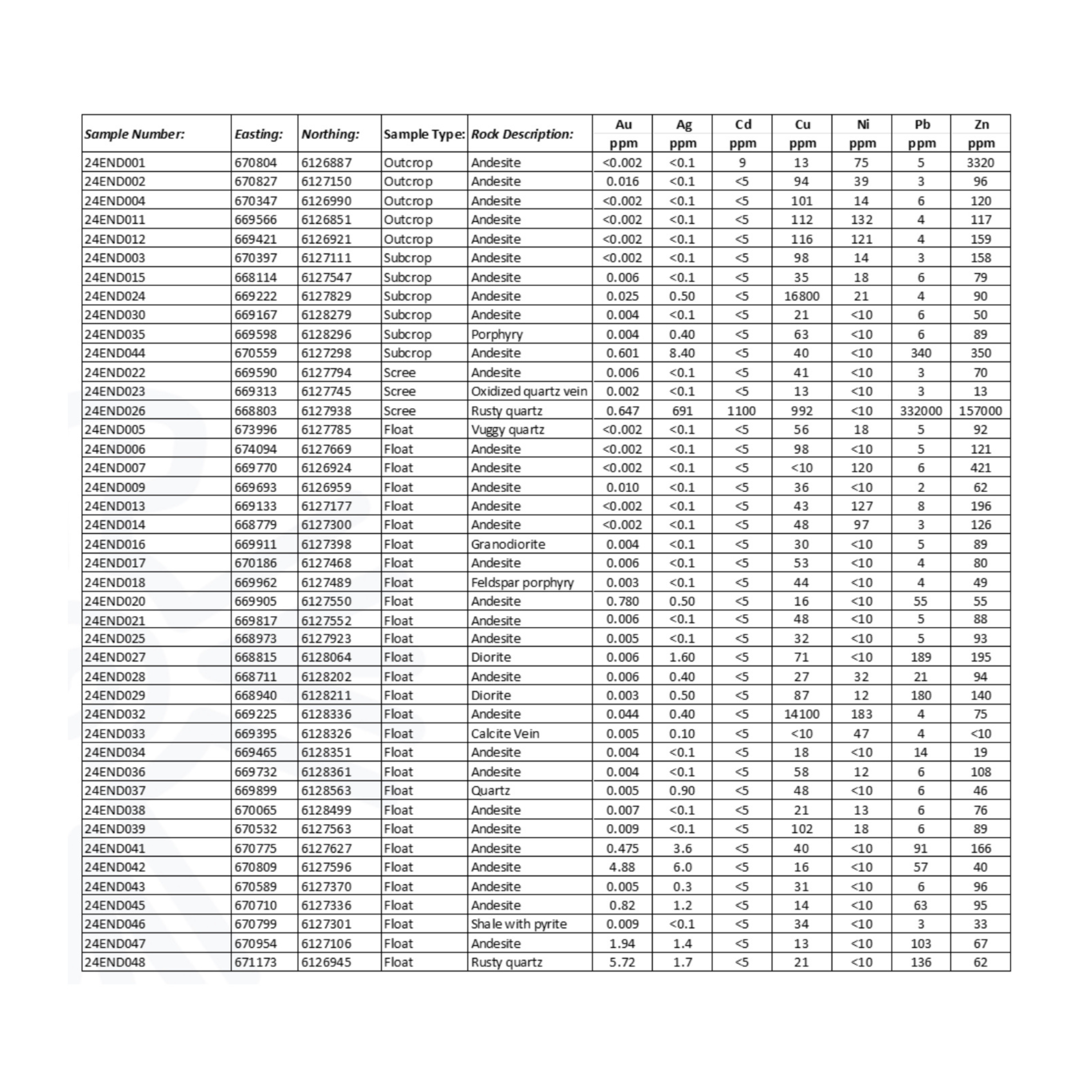 - 24END001 – Quartz carbonate w chalcopyrite & galena (outcrop) – 143 gpt or 4.6 oz/t Ag, 0.28% Cu, 0.89% Pb, 1.26% Zn