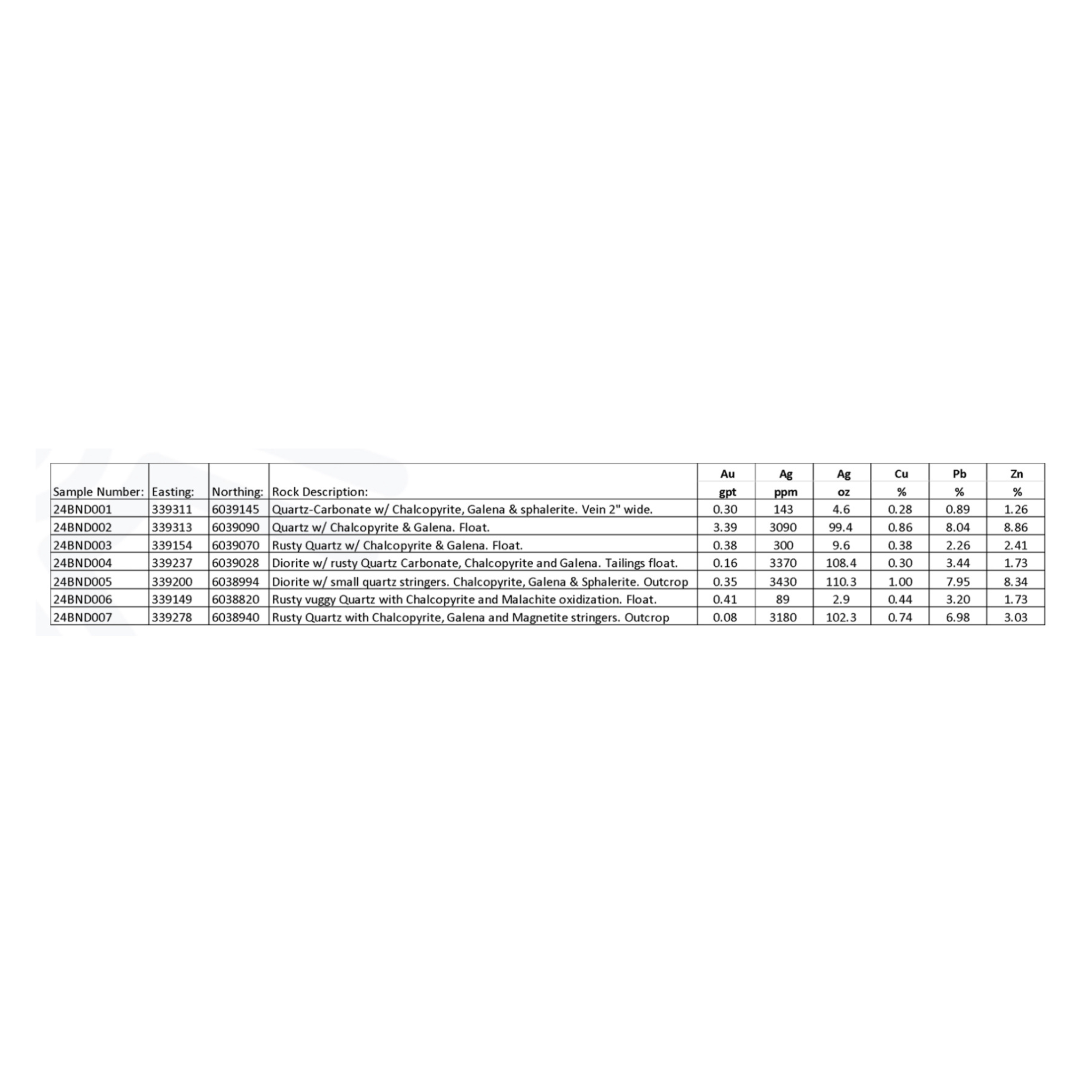 - 24END002 – Quartz w chalcopyrite (float) – 3.39 gpt Au, 3090 gpt or 99.4 oz/t Ag, 0.86% Cu, 8.04% Pb, 8.86% Zn